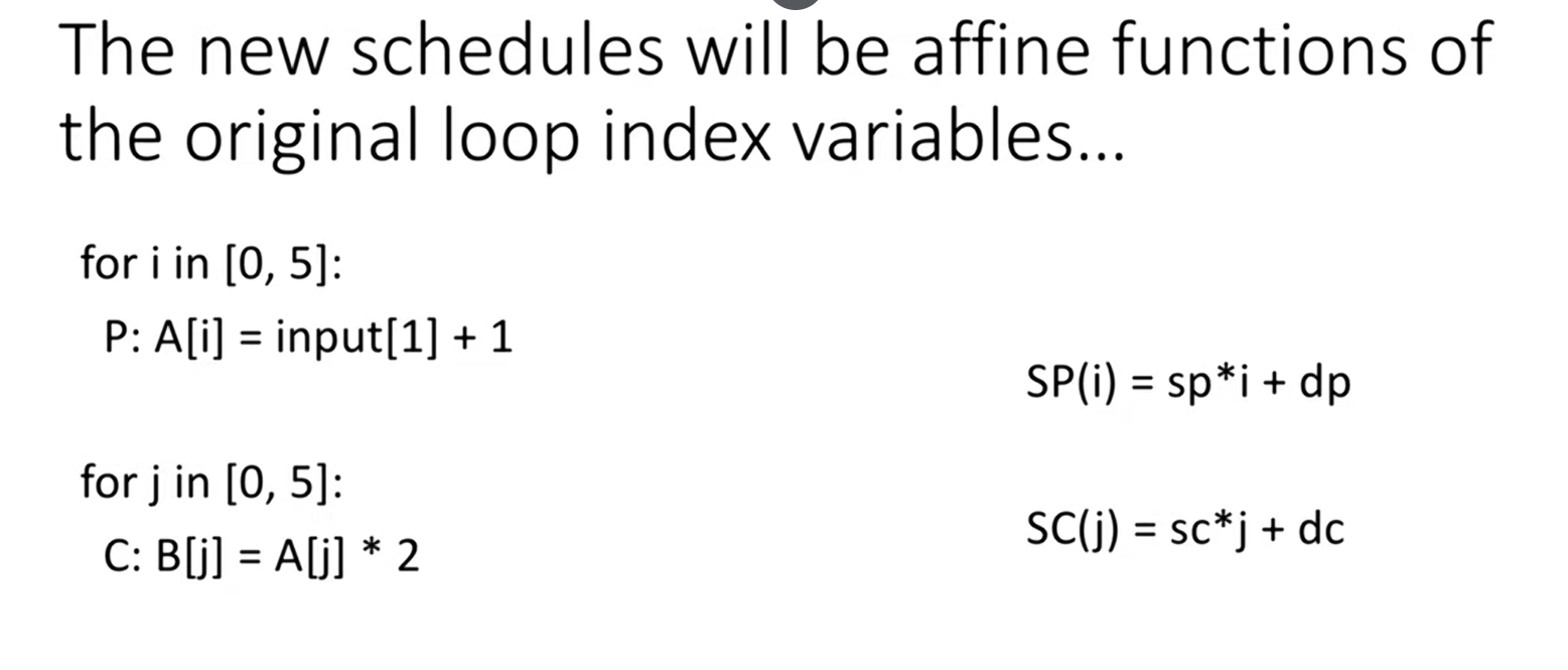 注意到,这里引入了sp与dp来对原本的i做仿射变换,从而使得两个循环的时间表一致。这里的sp与dp是调度变量,通过调整它们的值,可以实现不同的调度方式。