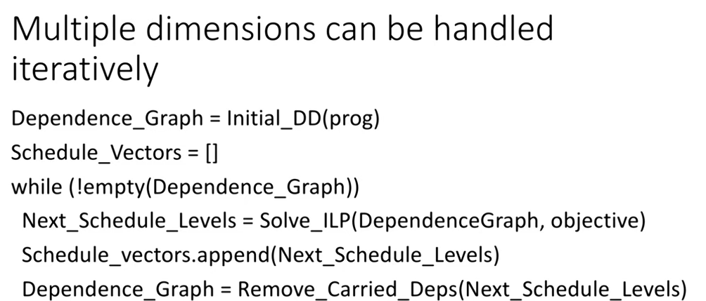 对于多维的循环,算法采用逐层处理的方式,先在最外层循环进行调度,然后逐层向内处理。首先构建一个依赖图,之后开始循环向内执行。每一次处理一个循环层次时,都会将当前层次的依赖关系加入到ILP中进行求解,并将处理过的依赖剔除。